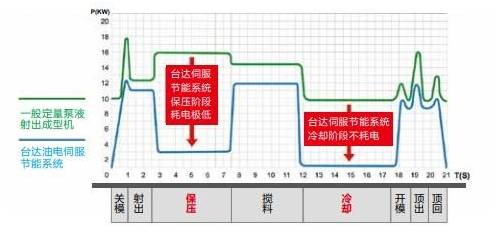 臺達油電伺服節能系統,能精確控制整個注塑過程所需的壓力與流量,消除高壓節流的能源損耗,達到節能省電的效果,同時降低系統油溫,是一舉數得的系統,節能率高達70%,平均節能率30%以上。