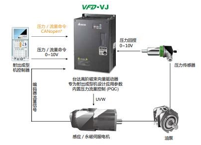 油壓驅動技術是目前射出成型機使用最廣泛的驅動控制方式,具有功率重量比大、壓力和流量控制佳、壽命長及易維護等優點;而交流伺服馬達驅動技術則具有響應快、精度高、恒轉矩等優點。臺達VFD-VJ系列油電伺服驅動器利用交流伺服馬達驅動的油壓系統,將伺服驅動技術、馬達技術與油壓技術結合,且以精確的壓力與流量控制,消除高壓節流的能源損耗,將射出成型機油壓驅動技術再度創新。此外,臺達在倡導綠色設計的理念及領先的環保技術上,亦提升了產品綠色制造的技術水平,為客戶創造更多價值。