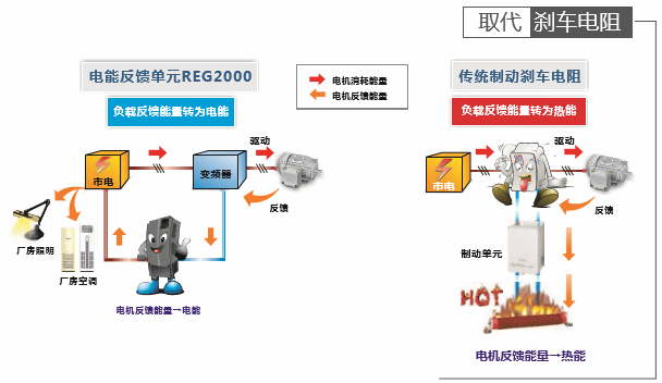 取代傳統(tǒng)動態(tài)煞車電阻裝置。一般傳統(tǒng)交流變頻器驅(qū)動馬達(dá)在運(yùn)動瞬間或頻繁煞車時(shí),利用安裝高瓦數(shù)的煞車電阻來吸收過多的反饋能量,并轉(zhuǎn)成熱能散發(fā)。解決負(fù)載能量反饋但效率不佳,且增加硬件額外費(fèi)用與空間。使用AFE2000系列之后,負(fù)載反饋的能量不需要再轉(zhuǎn)換成熱能散發(fā)掉,相對的可以將反饋能量回饋到電網(wǎng),省電省錢而且環(huán)保,如下圖所示。