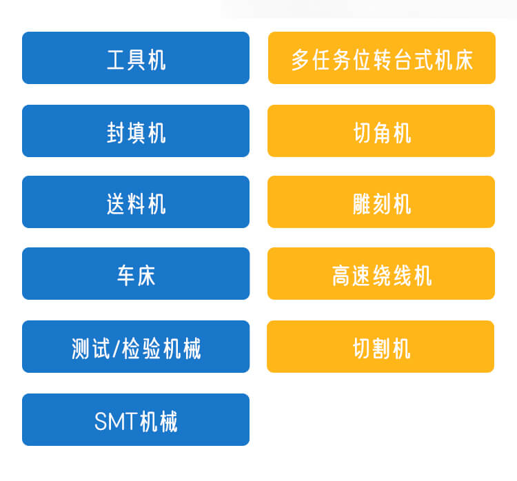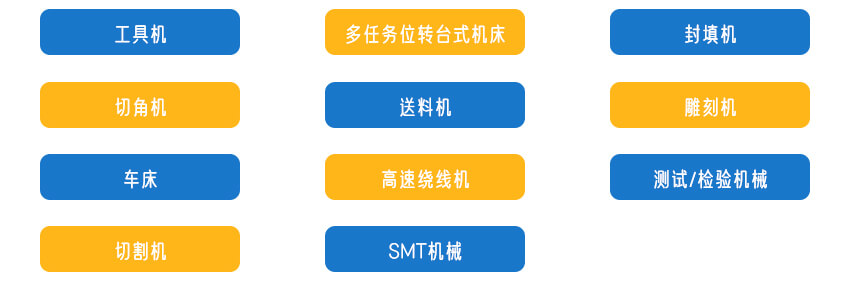 工具機、多任務位轉臺式機床、封填機、切角機、送料機、雕刻機、車床、高速繞線機、測試/檢驗機械、切割機、SMT機械